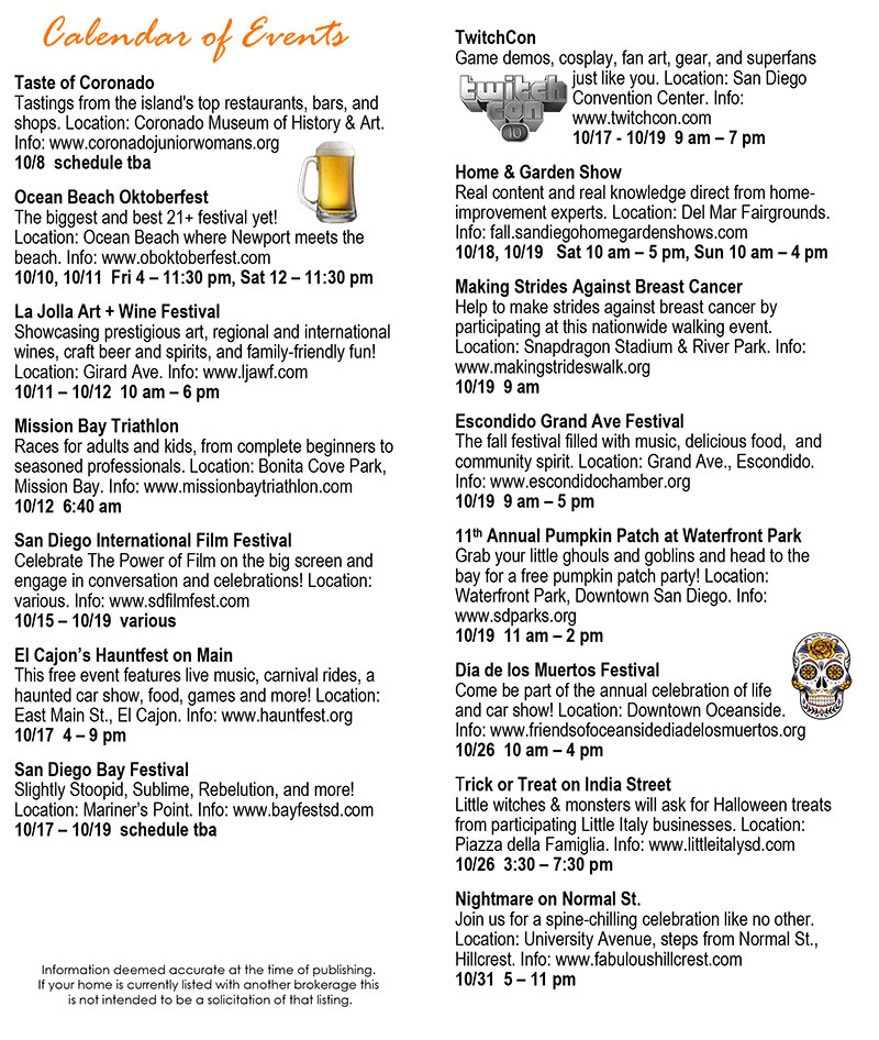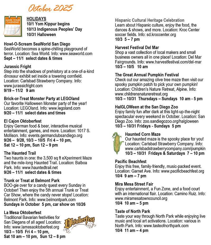 秋意漸濃的十月,聖地牙哥正迎來最舒適的季節!整座城市將綻放精彩紛呈的社區活動,從充滿歡笑的南瓜田到飄散書香的文化市集,從熱力四射的音樂祭到熱鬧的萬聖節派對。這個秋天,讓我們一起在燦爛陽光下,創造屬於這個季節的獨特回憶,探索這座城市最迷人的魅力。